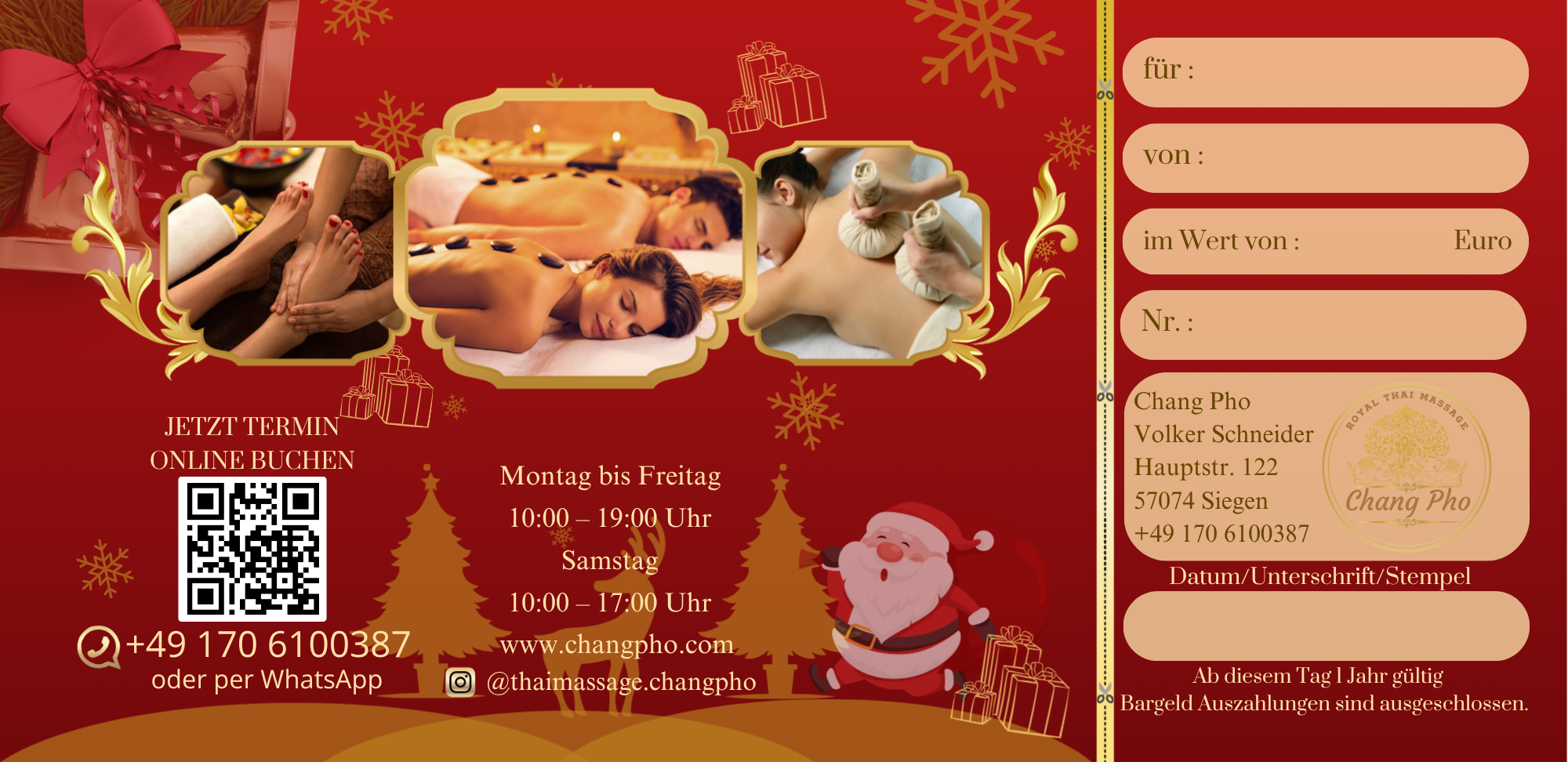 Ein Gutschein für eine Massage ist das perfekte Geschenk, um jemandem eine Auszeit und Entspannung zu schenken. Ob zu einem besonderen Anlass oder einfach nur so, die Freude über eine wohltuende Massage ist garantiert.